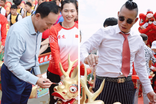 最具仪式感的“龙舟点睛”环节,9位受邀领导手持朱砂笔,依次为参赛龙舟轻点龙睛,这一延续千年的非遗仪式,既寄托着对赛事圆满的期许,更象征着非遗薪火在新时代的代代相传。